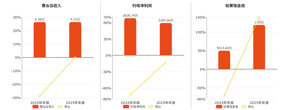 公司营业总收入为4.31亿元。归母净利润为3165.66万元,较去年同报告期归母净利润减少473.08万元,同比较去年同期下降13.00%。经营活动现金净流入为1.20亿元。