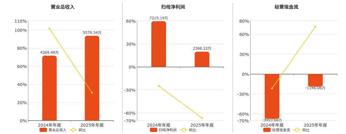 公司营业总收入为5579.34万元。归母净利润为2398.22万元,较去年同报告期归母净利润减少4816.97万元,同比较去年同期下降66.76%。经营活动现金净流入为-1146.06万元。