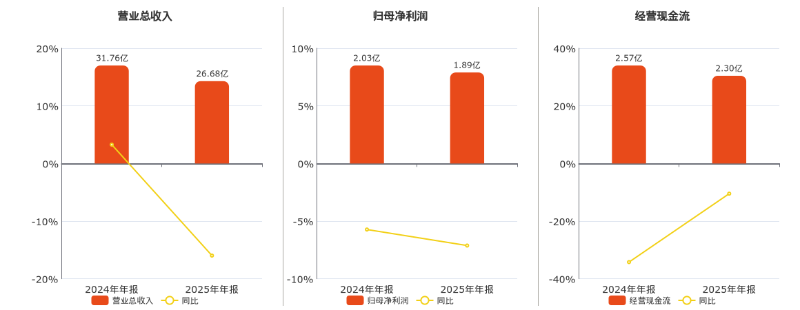 公司营业总收入为26.68亿元,较去年同报告期营业总收入减少5.08亿元,同比较去年同期下降15.98%。归母净利润为1.89亿元,较去年同报告期归母净利润减少1446.17万元,同比较去年同期下降7.12%。经营活动现金净流入为2.30亿元,较去年同报告期经营活动现金净流入减少2689.69万元,同比较去年同期下降10.47%。