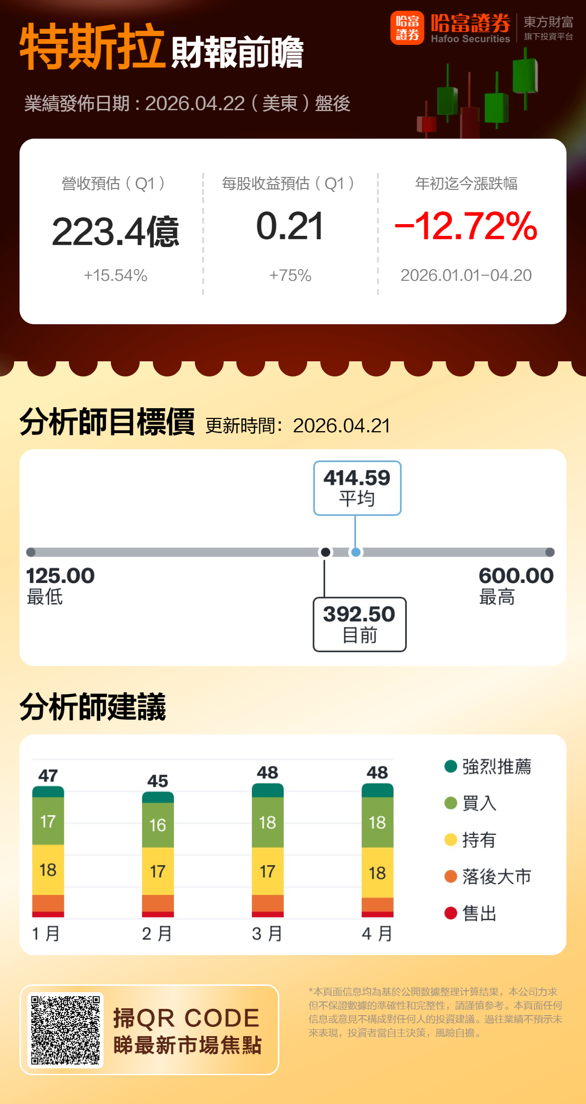 特斯拉将于4月22日美股盘后发布2026年Q1财报,市场预期特斯拉2026Q1预计实现营收223.4亿美元,同比增加15.54%;预期每股收益0.21美元,同比增加75%。(上述数据使用的会计准则为US-GAAP)