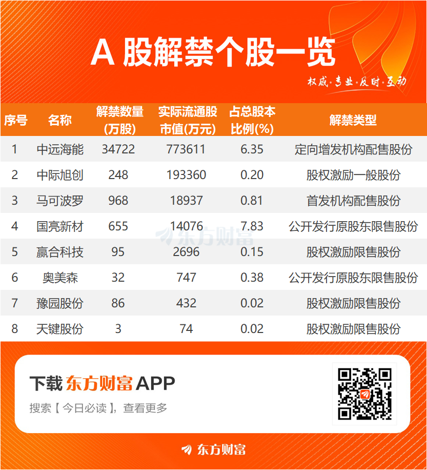 【明日解禁】明日8股解禁 中远海能、中际旭创解禁市值居前