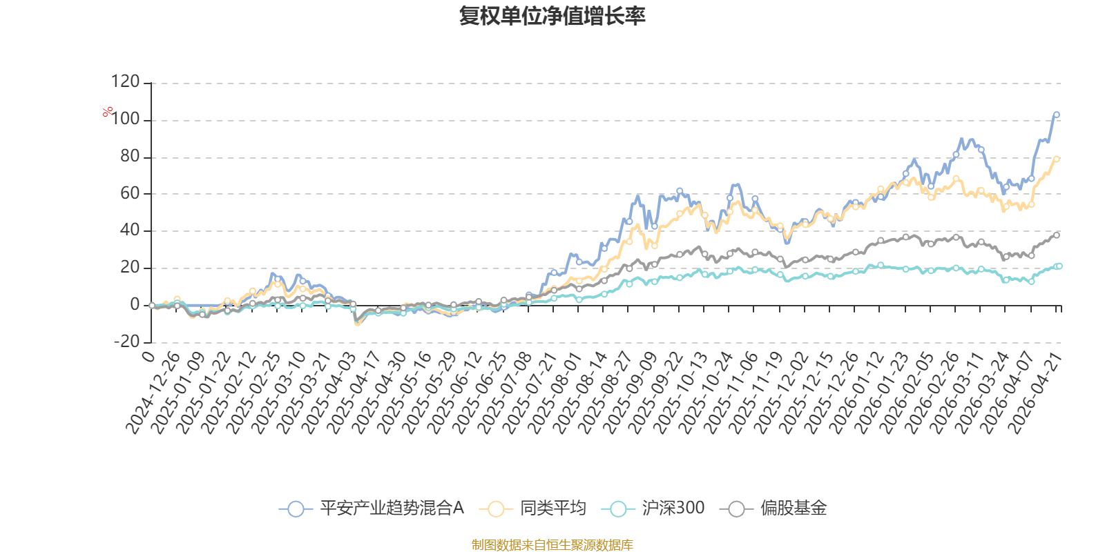 截至4月20日,平安产业趋势混合A近三个月复权单位净值增长率为24.25%,位于同类可比基金35/229;近半年复权单位净值增长率为41.50%,位于同类可比基金43/229;近一年复权单位净值增长率为112.22%,位于同类可比基金58/229。