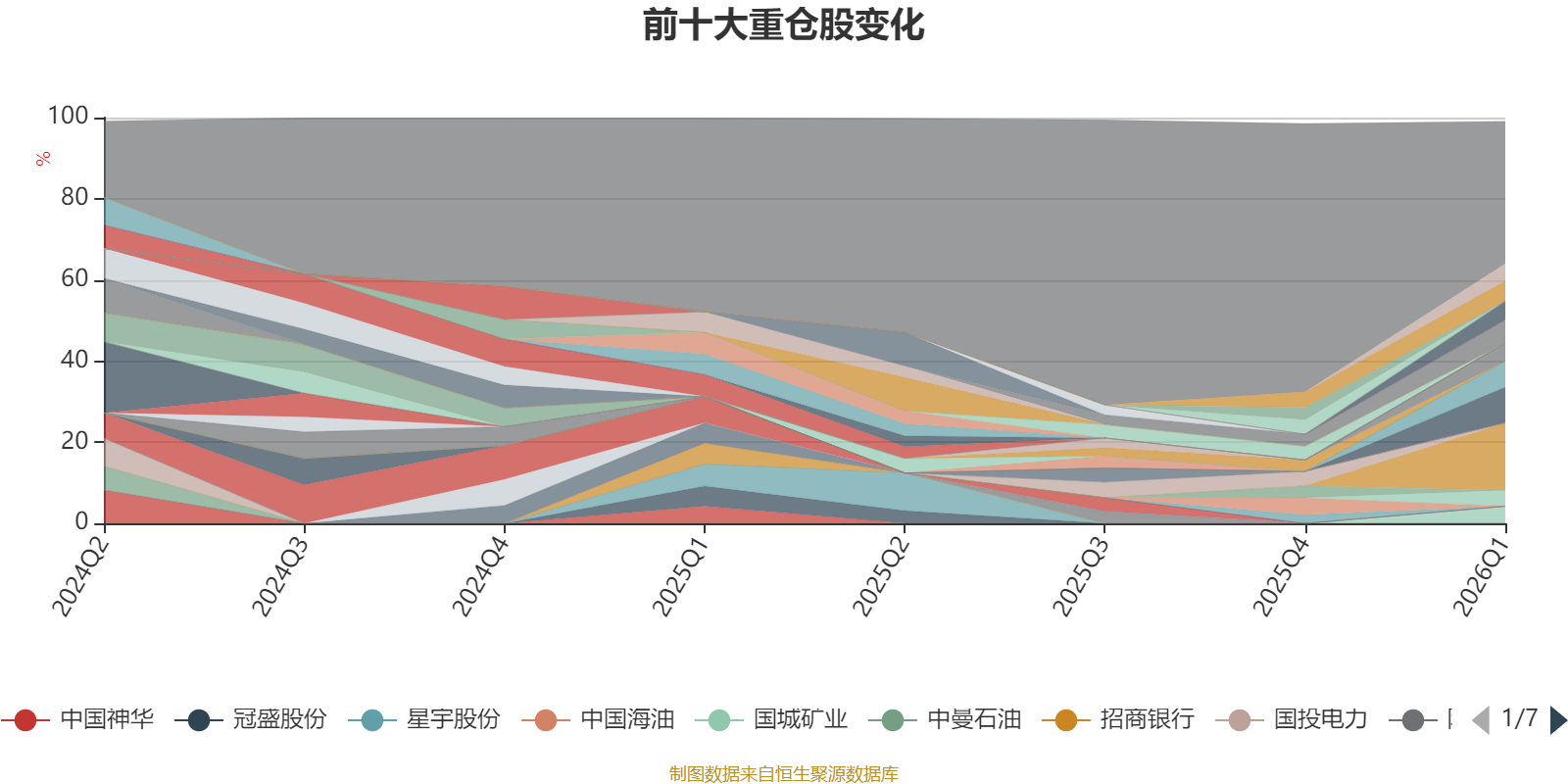 截至2026年一季度末,基金十大重仓股分别是农业银行、建设银行、长江电力、三一重工、宏桥控股、佳鑫国际资源、中国海洋石油、中国核电、国城矿业、中国动力。