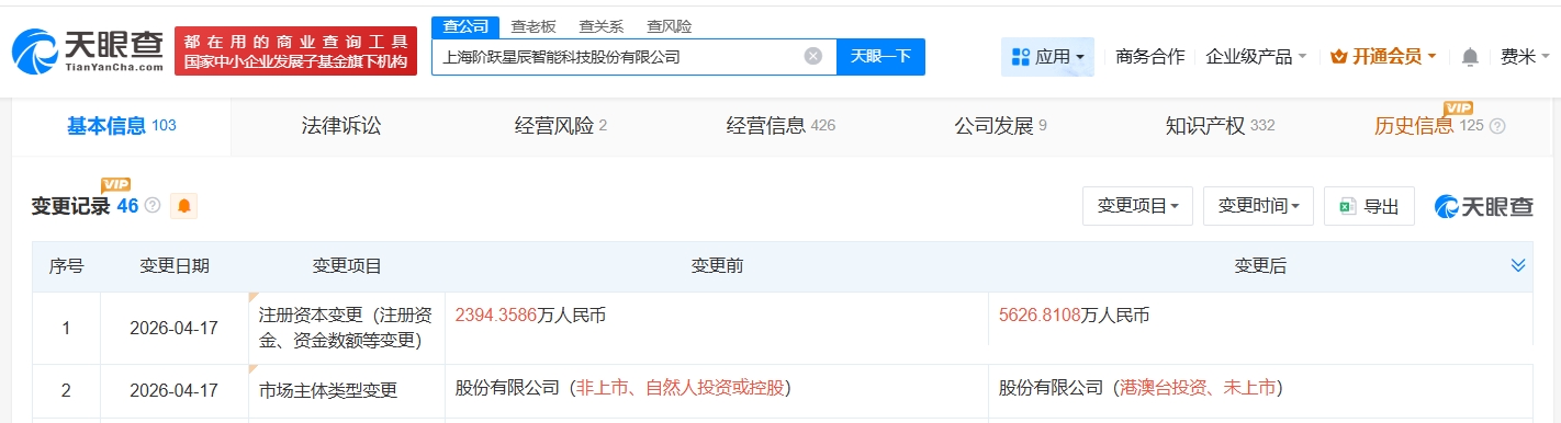 南方财经4月21日电,天眼查App显示,近日,上海阶跃星辰智能科技股份有限公司发生工商变更,注册资本由约2394万人民币增至约5627万人民币,增幅约135%。该公司成立于2023年4月,法定代表人为印奇,经营范围包括人工智能行业应用系统集成服务、人工智能应用软件开发、人工智能理论与算法软件开发等,由跃能齐鑫(上海)企业管理咨询有限公司、跃心聚能(上海)企业管理咨询合伙企业(有限合伙)、跃心聚力(上海)企业管理咨询合伙企业(有限合伙)等共同持股。