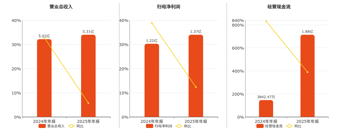 公司营业总收入为5.31亿元,较去年同报告期营业总收入增加2875.01万元,实现5年连续上涨,同比较去年同期上涨5.72%。归母净利润为1.37亿元,较去年同报告期归母净利润增加1503.84万元,实现2年连续上涨,同比较去年同期上涨12.34%。经营活动现金净流入为1.88亿元,较去年同报告期经营活动现金净流入增加1.49亿元,实现2年连续上涨,同比较去年同期上涨388.83%。