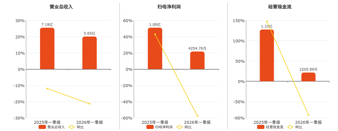 公司营业总收入为5.65亿元,较去年同报告期营业总收入减少1.53亿元,同比较去年同期下降21.33%。归母净利润为4254.76万元,较去年同报告期归母净利润减少5767.94万元,同比较去年同期下降57.55%。经营活动现金净流入为2205.99万元,较去年同报告期经营活动现金净流入减少1.09亿元,同比较去年同期下降83.12%。