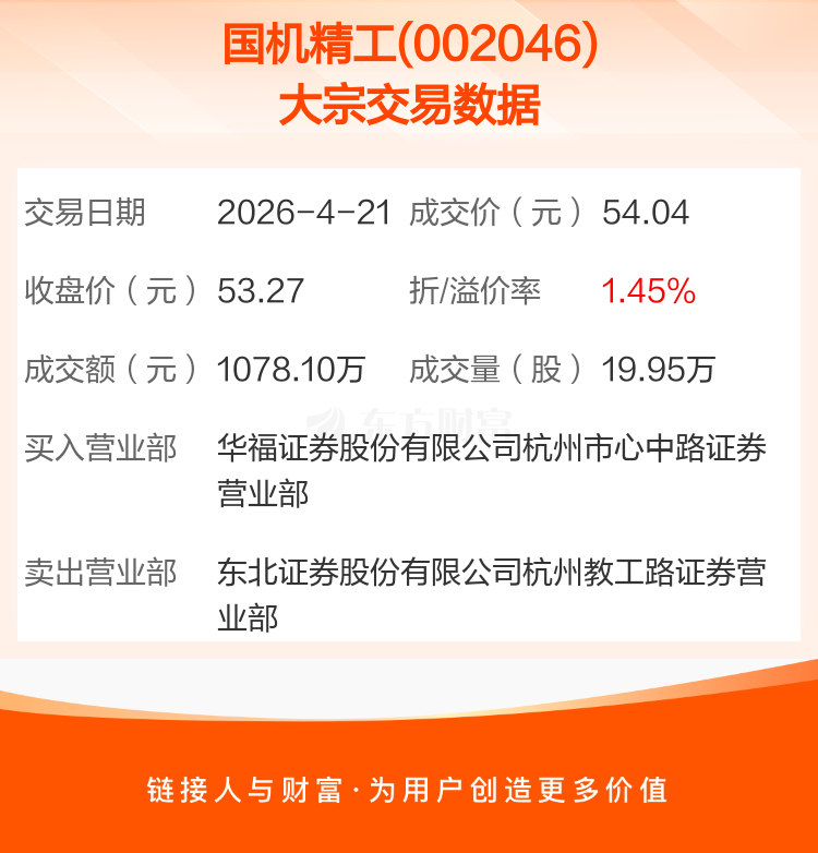 2026年4月21日,国机精工发生1笔大宗交易,共成交19.95万股,成交金额1078.10万元,占其流通市值比例为0.04%。