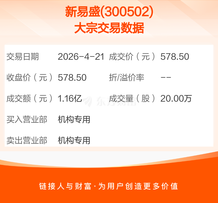 2026年4月21日,新易盛发生1笔大宗交易,共成交20.00万股,成交金额1.16亿元,占其流通市值比例为0.02%。