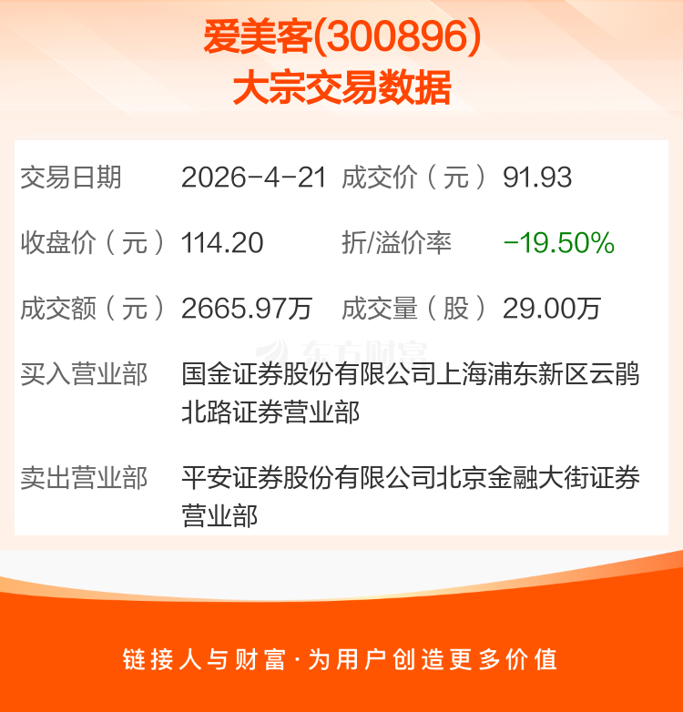 2026年4月21日,爱美客发生1笔大宗交易,共成交29.00万股,成交金额2665.97万元,占其流通市值比例为0.11%。