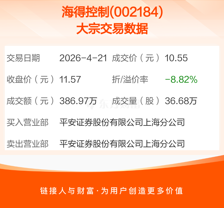 2026年4月21日,海得控制发生1笔大宗交易,共成交36.68万股,成交金额386.97万元,占其流通市值比例为0.14%。