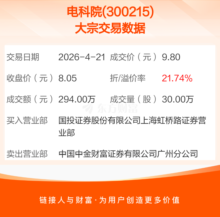 大宗交易:电科院成交294.00万元,溢价21.74%(4-21)
