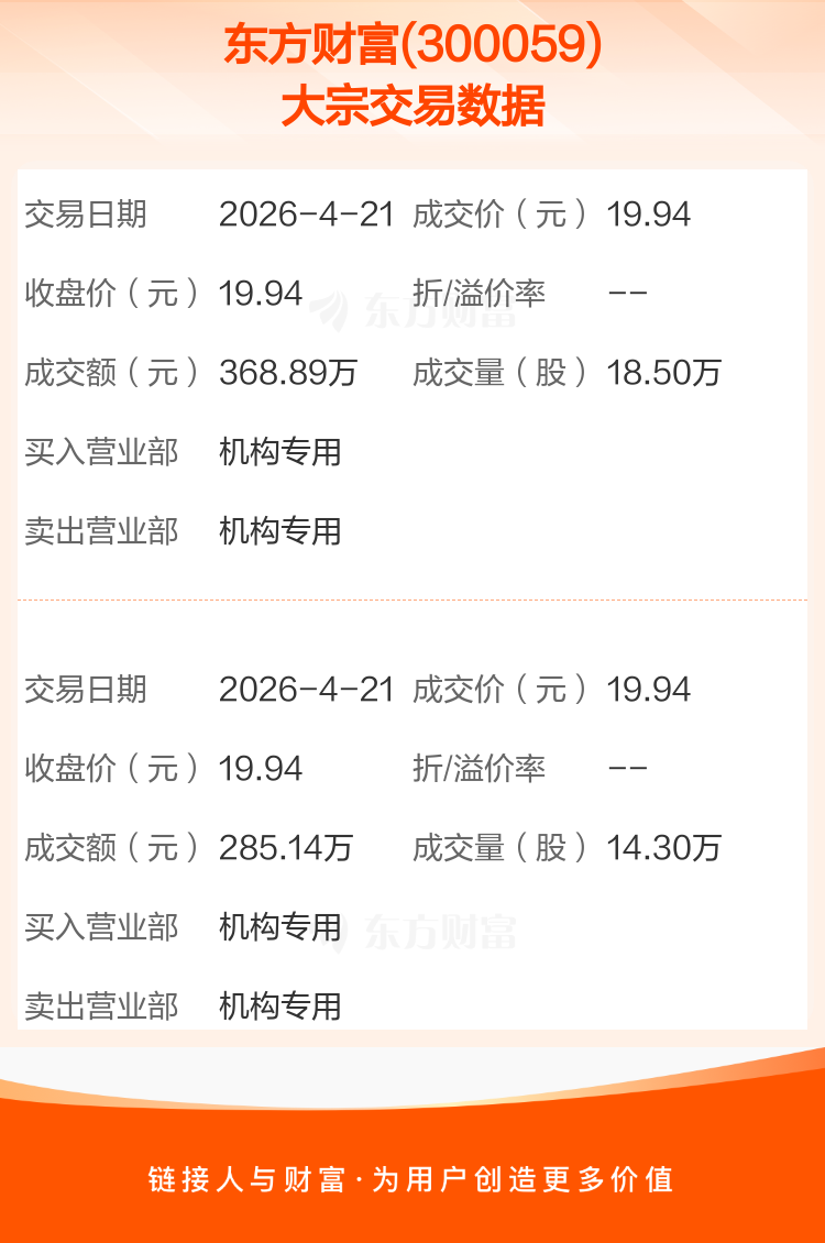 2026年4月21日,东方财富发生2笔大宗交易,共成交32.80万股,成交金额654.03万元。
