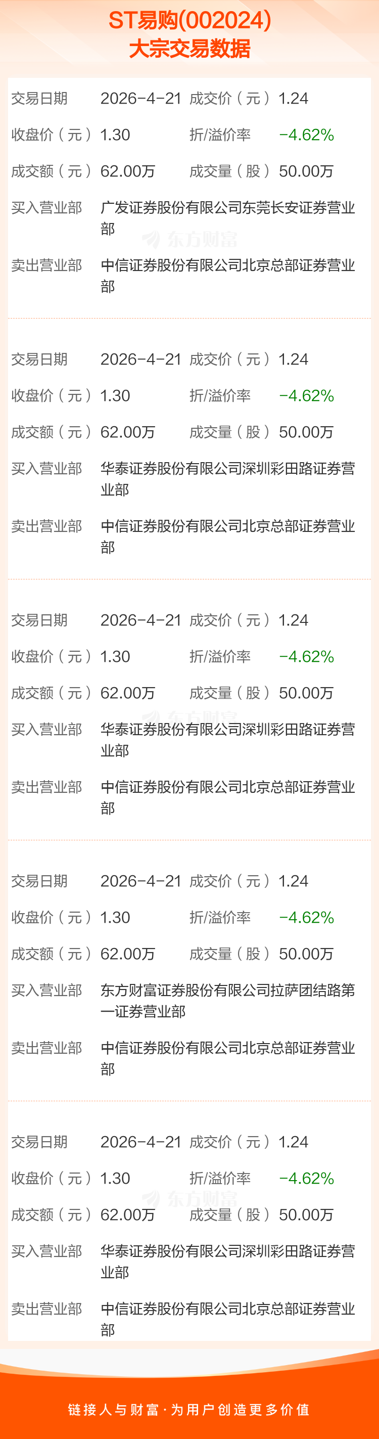 2026年4月21日,ST易购发生5笔大宗交易,共成交250.00万股,成交金额310.00万元,占其流通市值比例为0.03%。