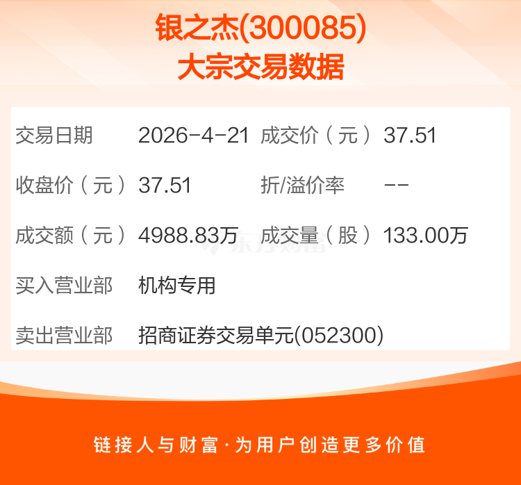 2026年4月21日,银之杰发生1笔大宗交易,共成交133.00万股,成交金额4988.83万元,占其流通市值比例为0.20%。