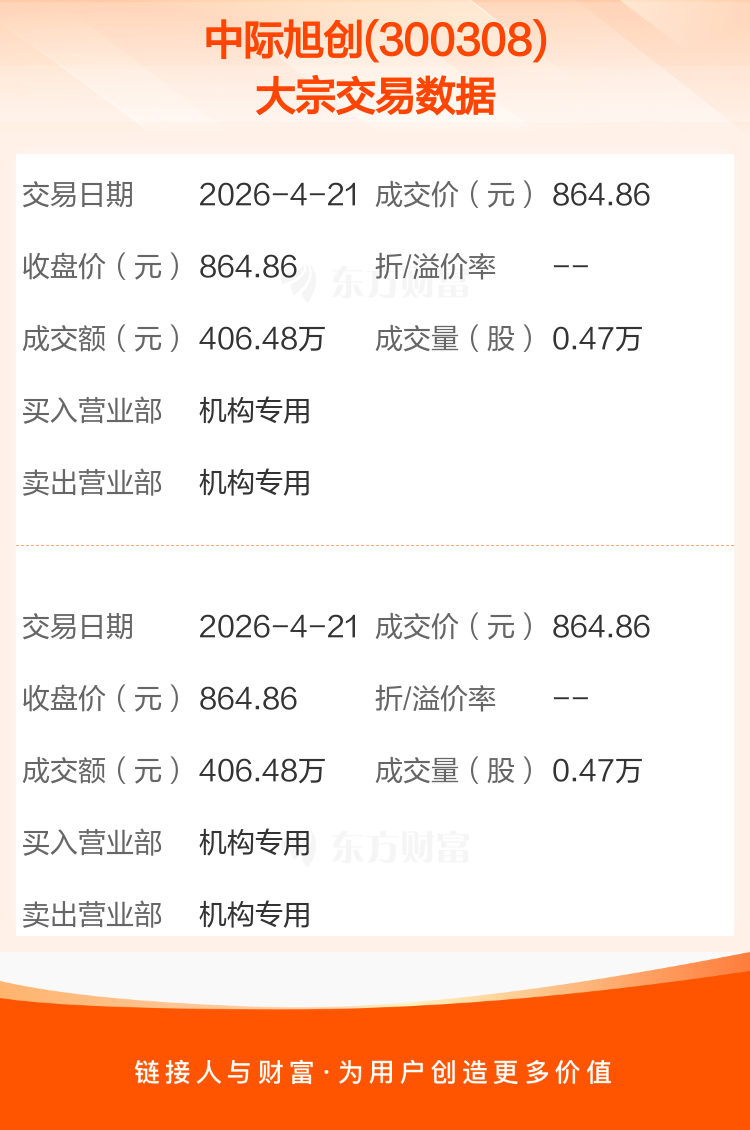 2026年4月21日,中际旭创发生2笔大宗交易,共成交9400股,成交金额812.96万元。