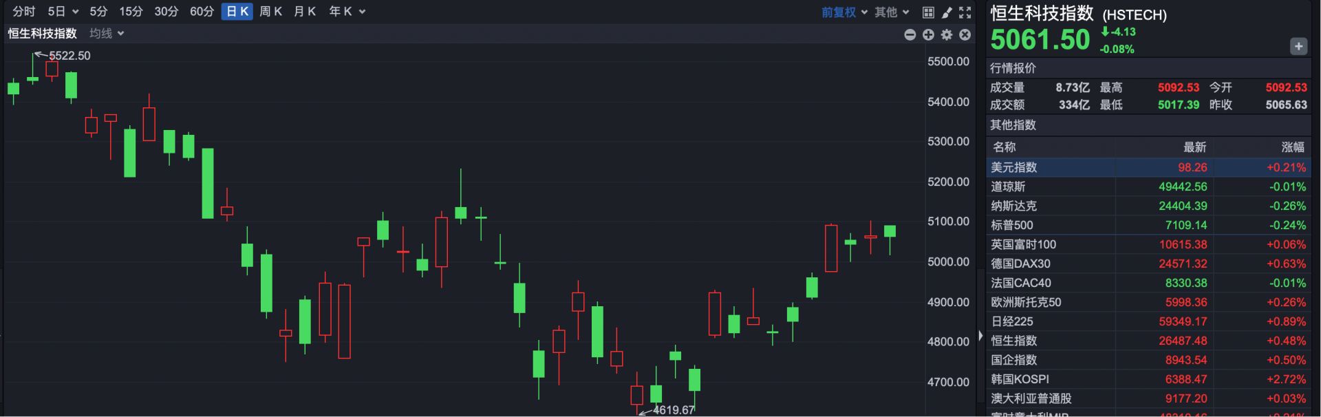 恒生科技指数收盘报5061.50点,下跌4.13点,跌幅0.08%。