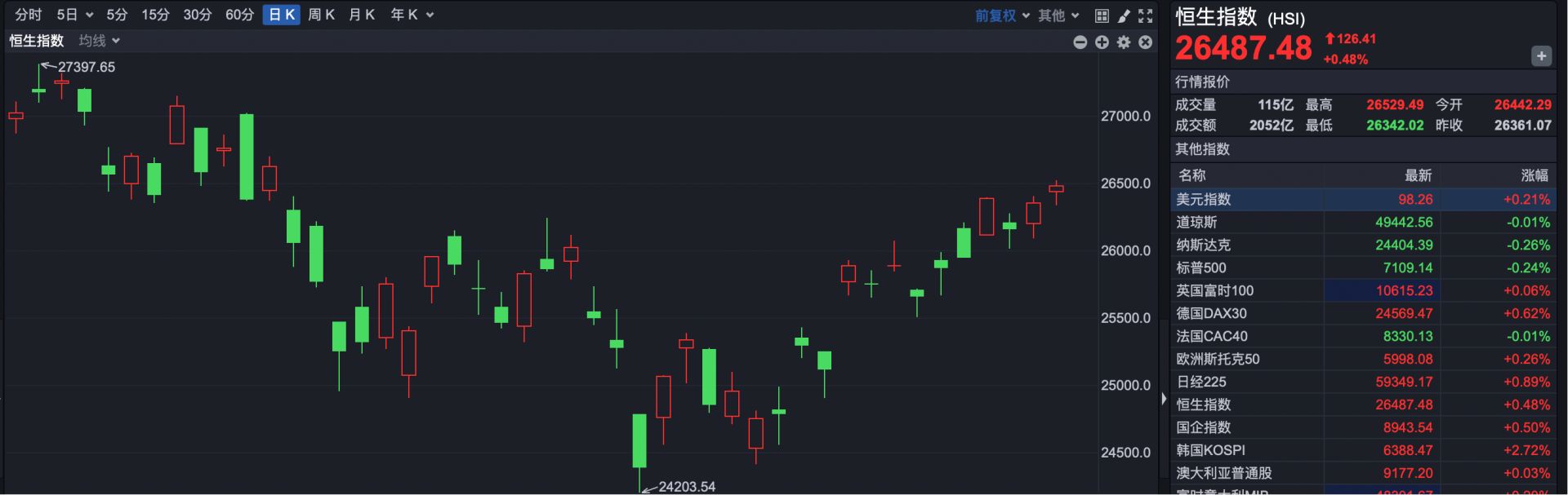 截至收盘,恒生指数报26487.48点,上涨126.41点,涨幅0.48%。