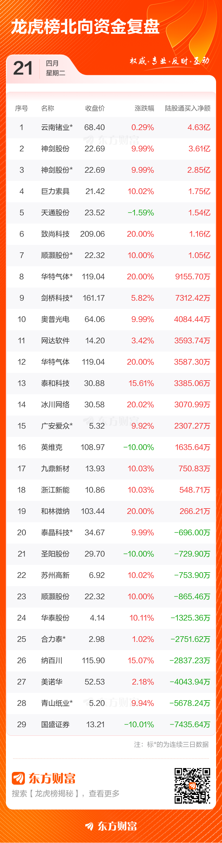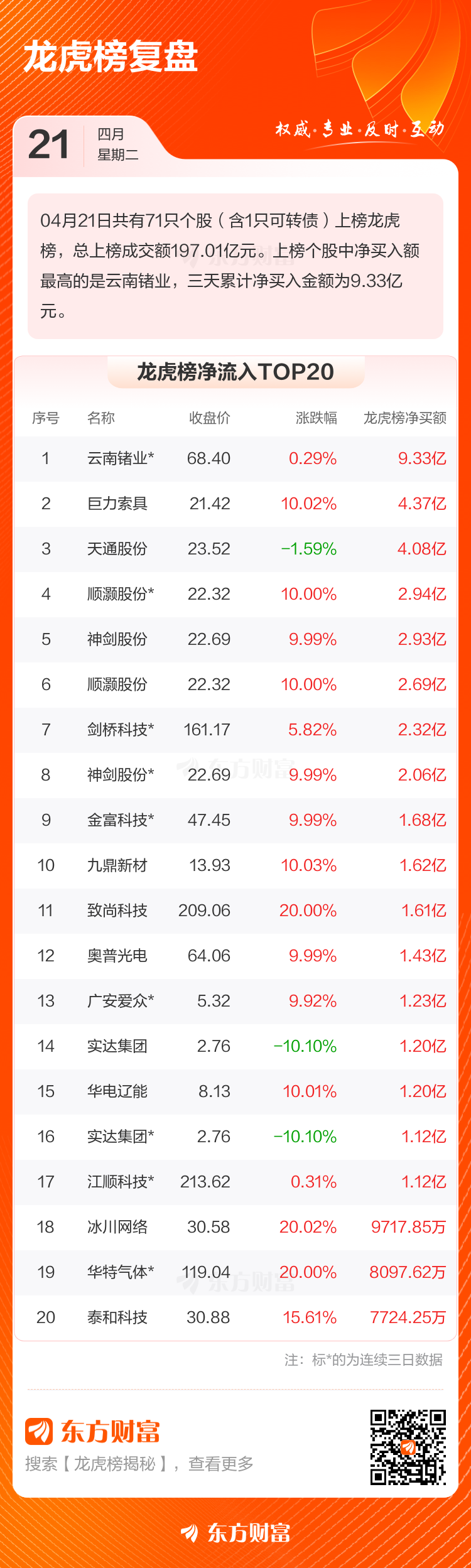 4月21日共有71只个股(含1只可转债)上榜龙虎榜,总上榜成交额197.01亿元。上榜个股中净买入额最高的是云南锗业,三天累计净买入金额为9.33亿元。