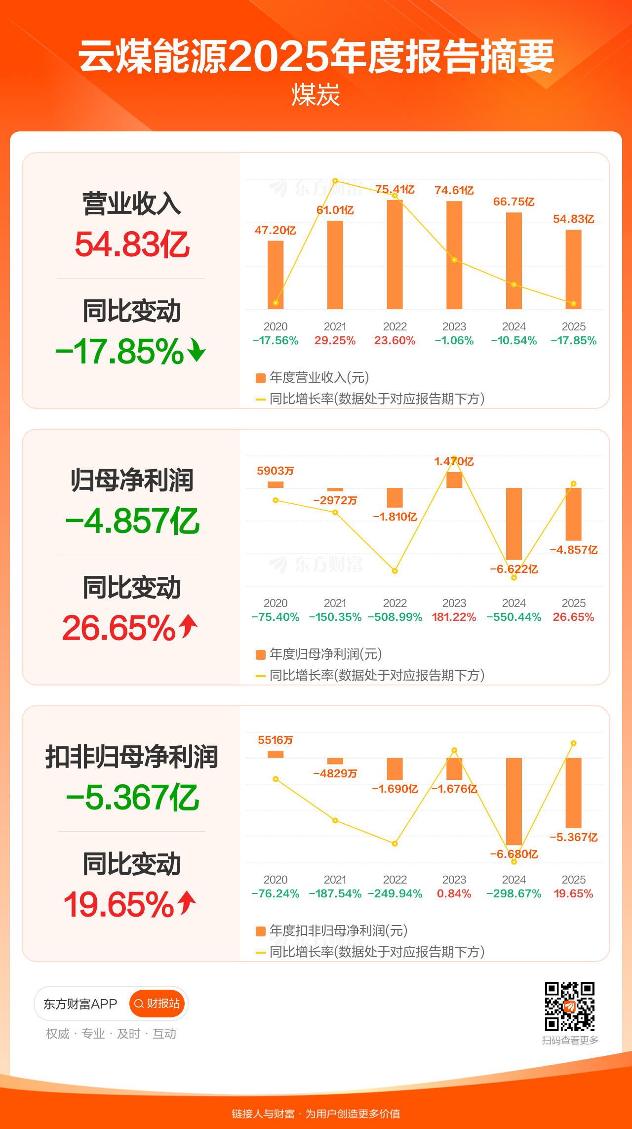 云煤能源4月22日发布2025年年报显示,公司全年实现营业收入54.83亿元,同比下滑17.85%;归母净利润-4.86亿元;扣非归母净利润-5.37亿元。