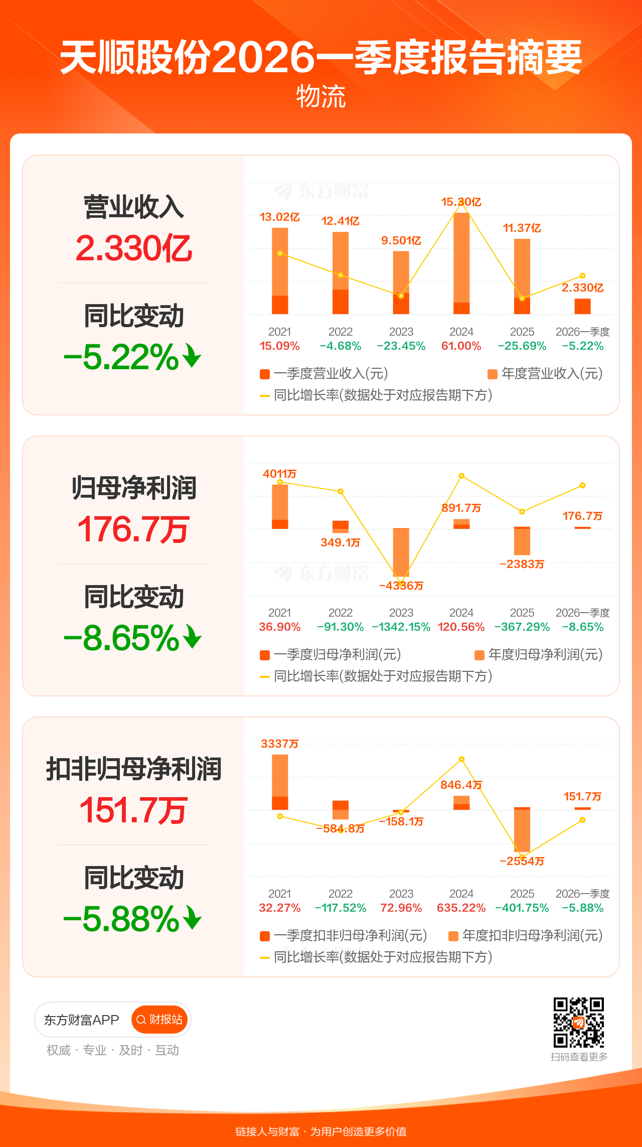 天顺股份4月22日发布2026年一季报显示,公司一季度实现营业收入2.33亿元,同比下滑5.22%;归母净利润176.73万元,同比下滑8.65%;扣非归母净利润151.70万元,同比下滑5.88%。