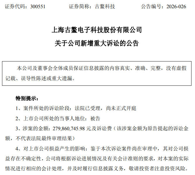 古鳌科技同时称,本次诉讼为偶发合同纠纷,不影响公司核心业务、经营秩序与持续发展能力。