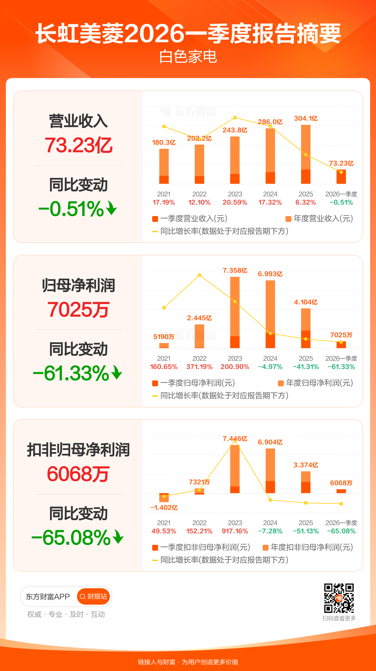 长虹美菱4月22日发布2026年一季报显示,公司一季度实现营业收入73.23亿元,同比下滑0.51%;归母净利润7024.56万元,同比下滑61.33%;扣非归母净利润6067.68万元,同比下滑65.08%。