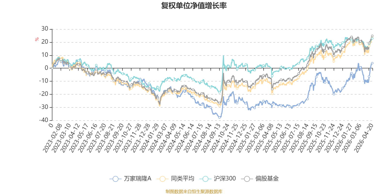 截至4月20日,万家瑞隆A近三个月复权单位净值增长率为14.42%,位于同类可比基金62/621;近半年复权单位净值增长率为16.31%,位于同类可比基金207/621;近一年复权单位净值增长率为44.96%,位于同类可比基金265/618;近三年复权单位净值增长率为-1.50%,位于同类可比基金462/560。