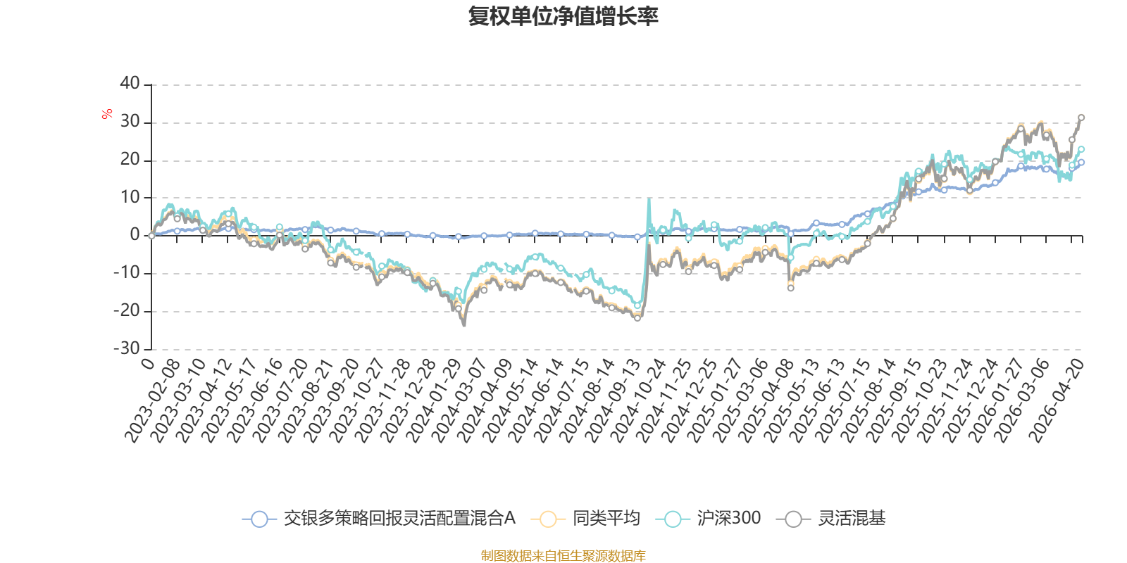 截至4月20日,交银多策略回报灵活配置混合A近三个月复权单位净值增长率为2.00%,位于同类可比基金534/1287;近半年复权单位净值增长率为6.74%,位于同类可比基金747/1286;近一年复权单位净值增长率为17.90%,位于同类可比基金913/1286;近三年复权单位净值增长率为17.08%,位于同类可比基金649/1286。