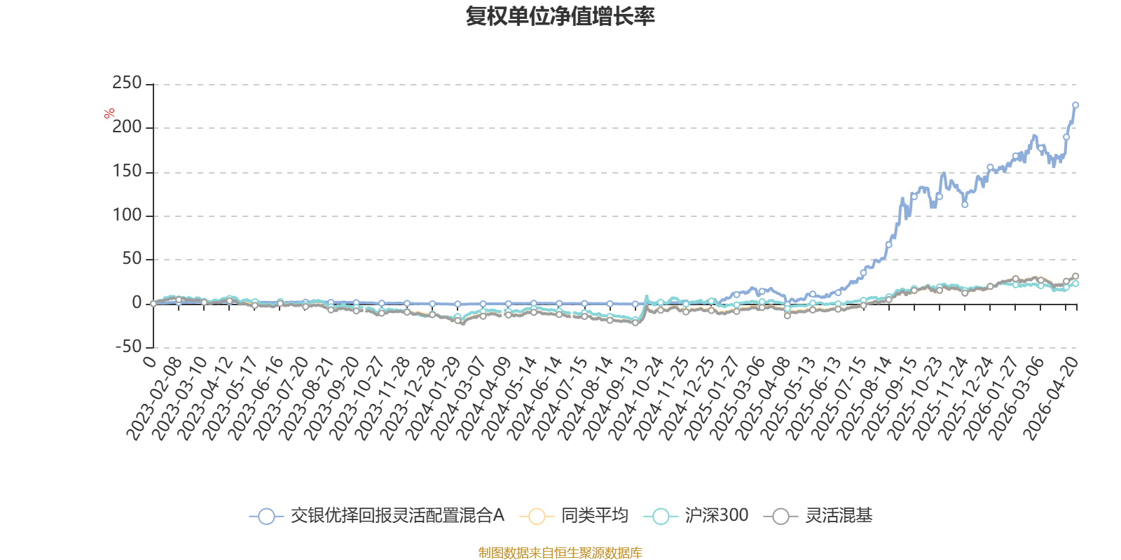 截至4月20日,交银优择回报灵活配置混合A近三个月复权单位净值增长率为27.67%,位于同类可比基金30/1287;近半年复权单位净值增长率为52.18%,位于同类可比基金31/1286;近一年复权单位净值增长率为218.90%,位于同类可比基金8/1286;近三年复权单位净值增长率为219.29%,位于同类可比基金4/1286。