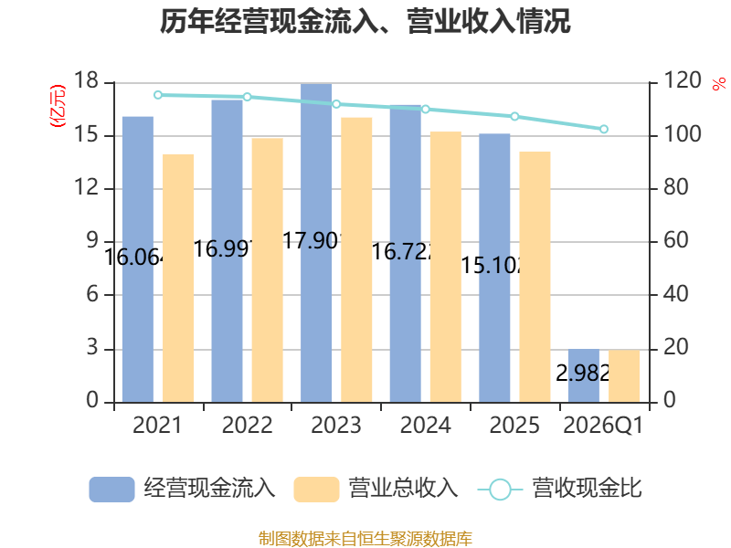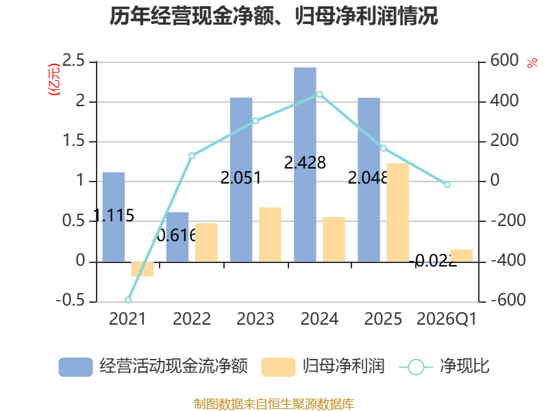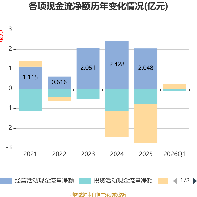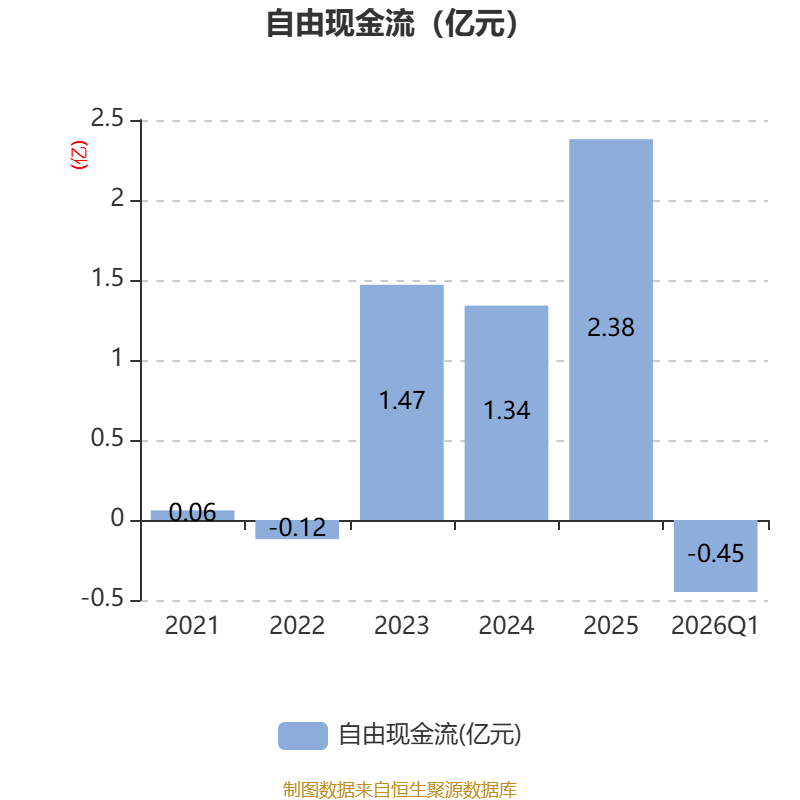 截至2026年一季度末,公司经营活动现金流净额为-219.39万元,同比减少6477.34万元;筹资活动现金流净额2463.79万元,同比增加3242.4万元;投资活动现金流净额-1081.94万元,上年同期为-2317.59万元。