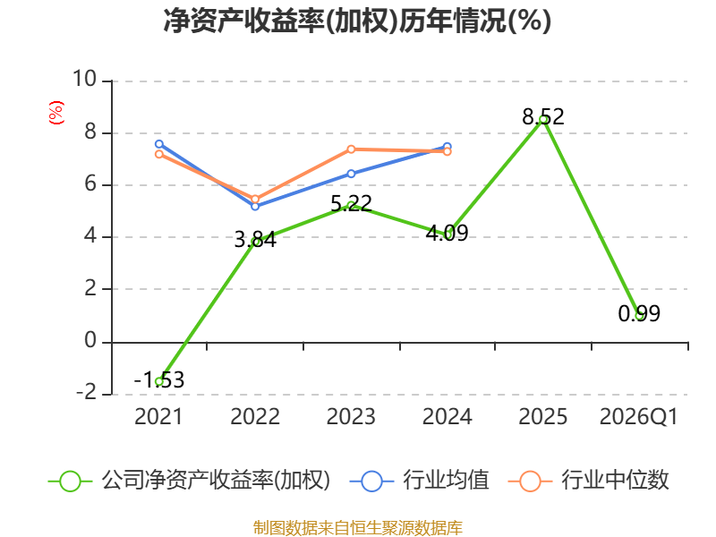 盈利能力方面, 2026年一季度公司加权平均净资产收益率为0.99%,同比上升0.49个百分点。公司2026年第一季度投入资本回报率为0.9%,较上年同期上升0.44个百分点。