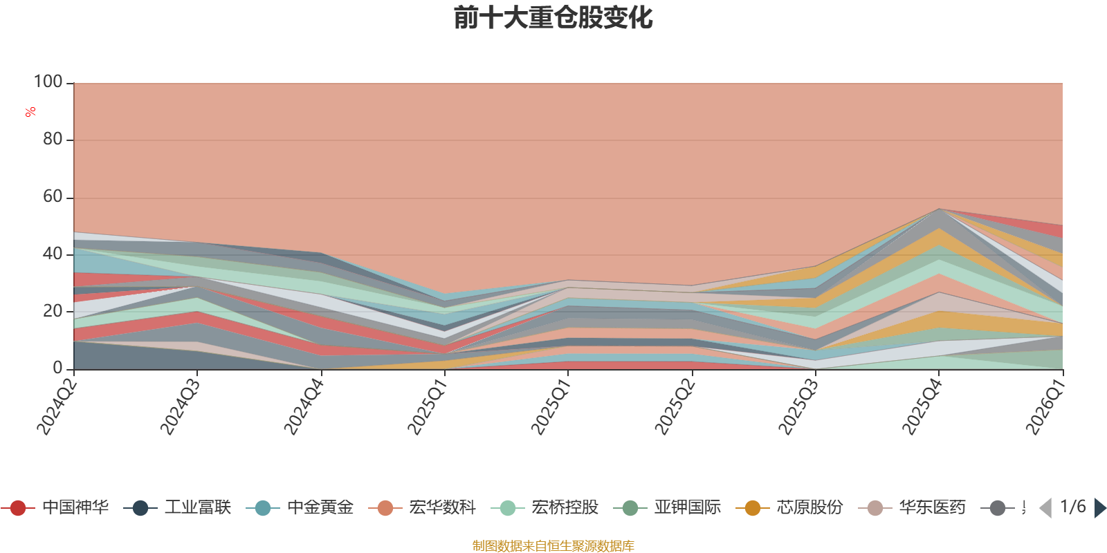 截至2026年一季度末,基金十大重仓股分别是亚钾国际、新强联、比亚迪、大金重工、鼎通科技、协创数据、安琪酵母、宁德时代、徐工机械、中国中免。