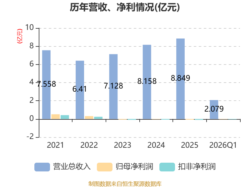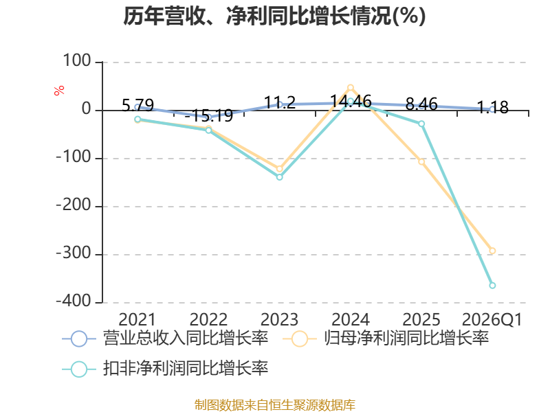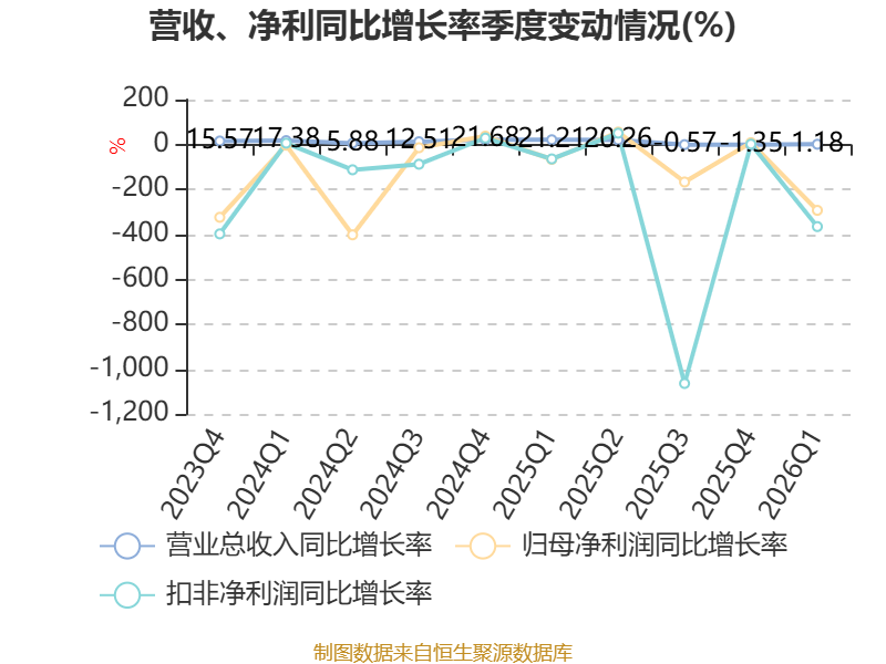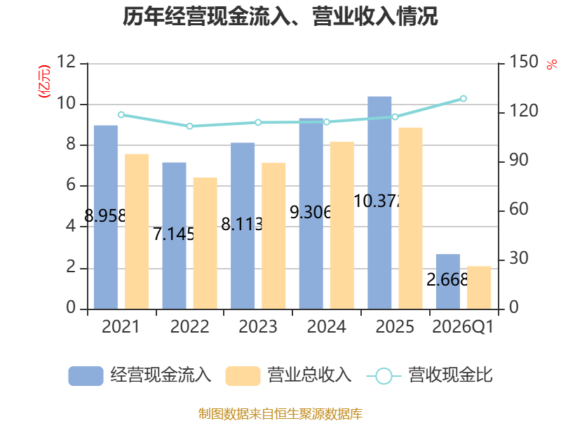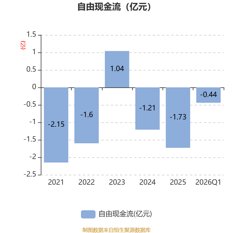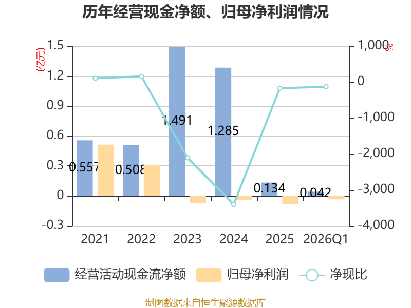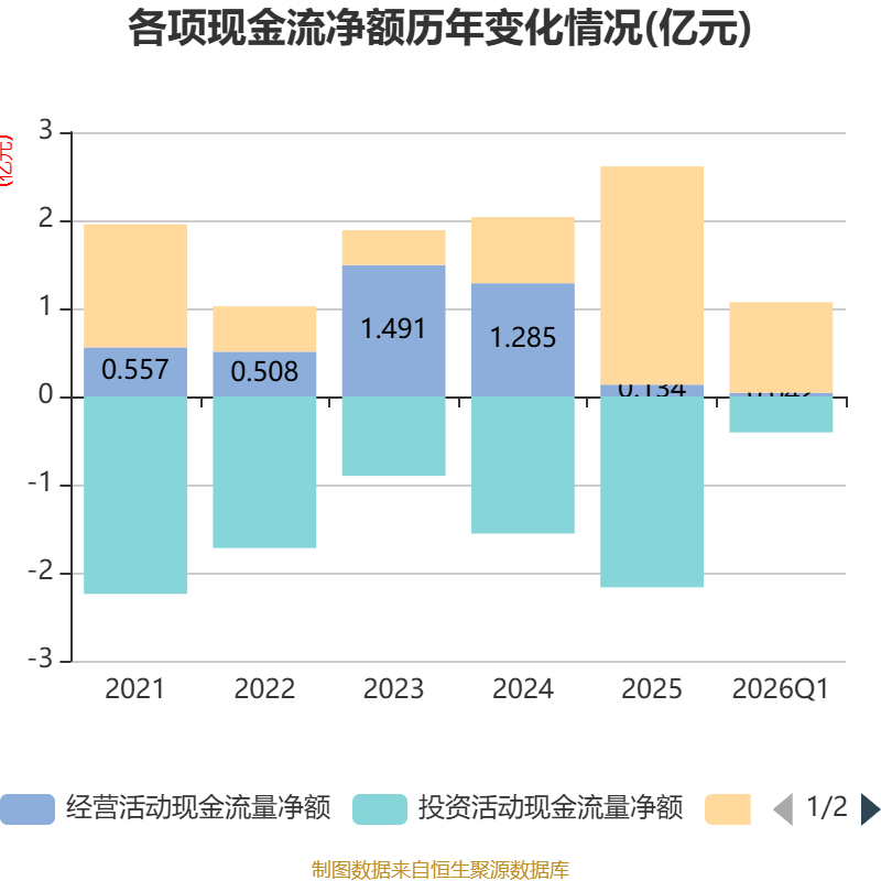 截至2026年一季度末,公司经营活动现金流净额为424.19万元,同比增加776.38万元;筹资活动现金流净额1.03亿元,同比减少1161.83万元;投资活动现金流净额-4081.3万元,上年同期为-9507.84万元。
