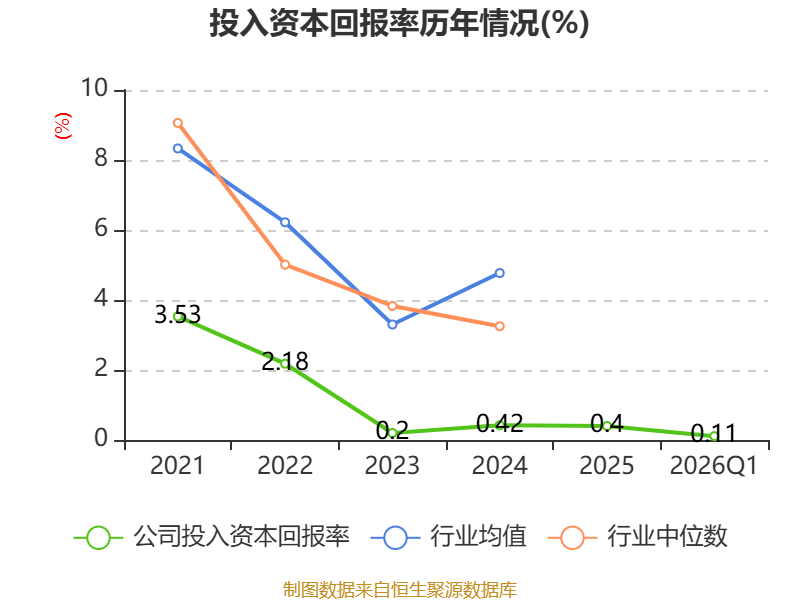 盈利能力方面, 2026年一季度公司加权平均净资产收益率为-0.24%,同比下降0.36个百分点。公司2026年第一季度投入资本回报率为0.11%,较上年同期下降0.14个百分点。