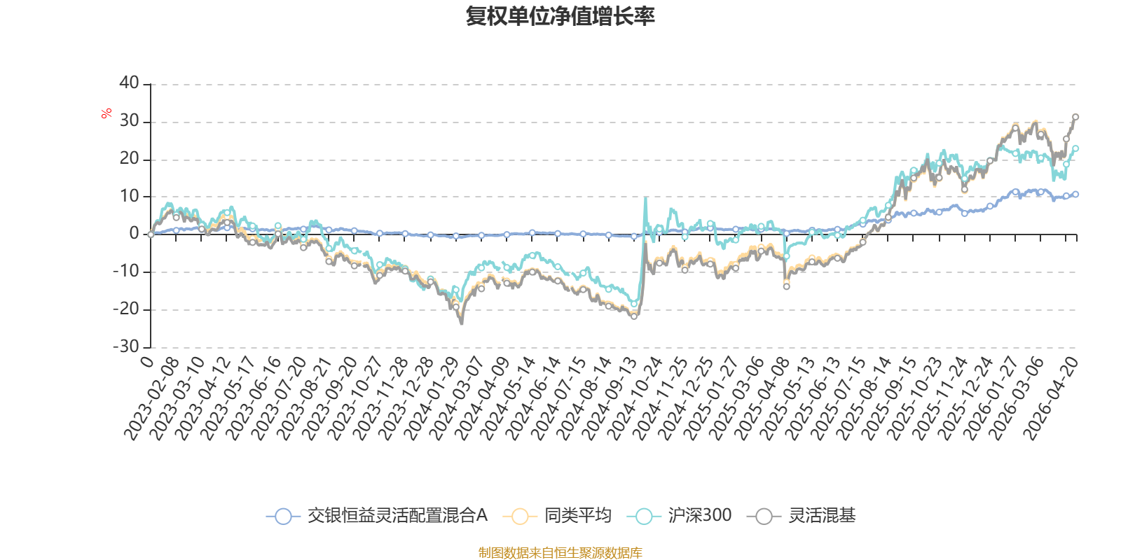 截至4月20日,交银恒益灵活配置混合A近三个月复权单位净值增长率为-0.25%,位于同类可比基金800/1287;近半年复权单位净值增长率为4.88%,位于同类可比基金833/1286;近一年复权单位净值增长率为9.53%,位于同类可比基金1053/1286;近三年复权单位净值增长率为8.65%,位于同类可比基金855/1286。
