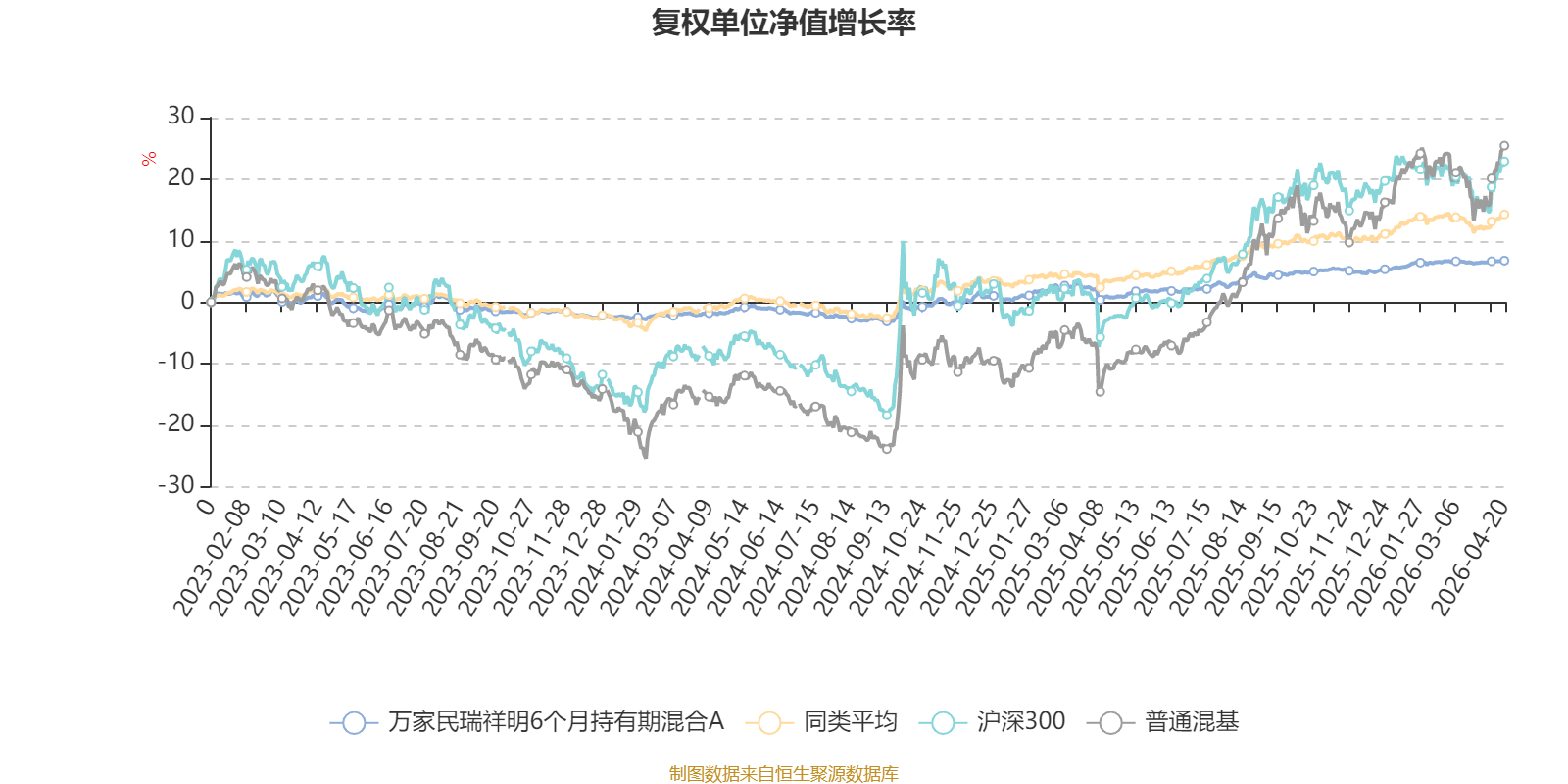 截至4月20日,万家民瑞祥明6个月持有期混合A近三个月复权单位净值增长率为0.43%,位于同类可比基金310/629;近半年复权单位净值增长率为1.88%,位于同类可比基金397/629;近一年复权单位净值增长率为6.01%,位于同类可比基金407/629;近三年复权单位净值增长率为6.02%,位于同类可比基金468/582。