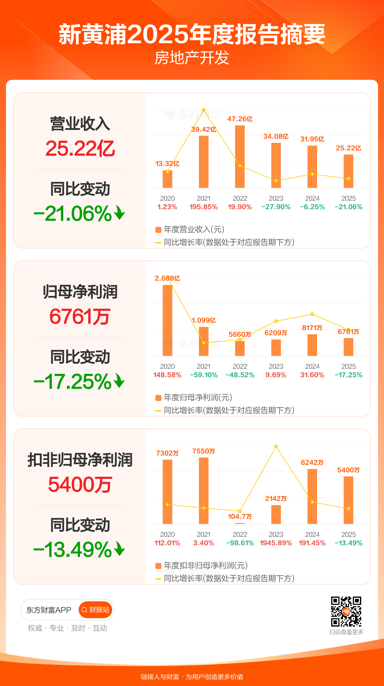 新黄浦4月22日发布2025年年报显示,公司全年实现营业收入25.22亿元,同比下滑21.06%;归母净利润6760.97万元,同比下滑17.25%;扣非归母净利润5400.01万元,同比下滑13.49%。