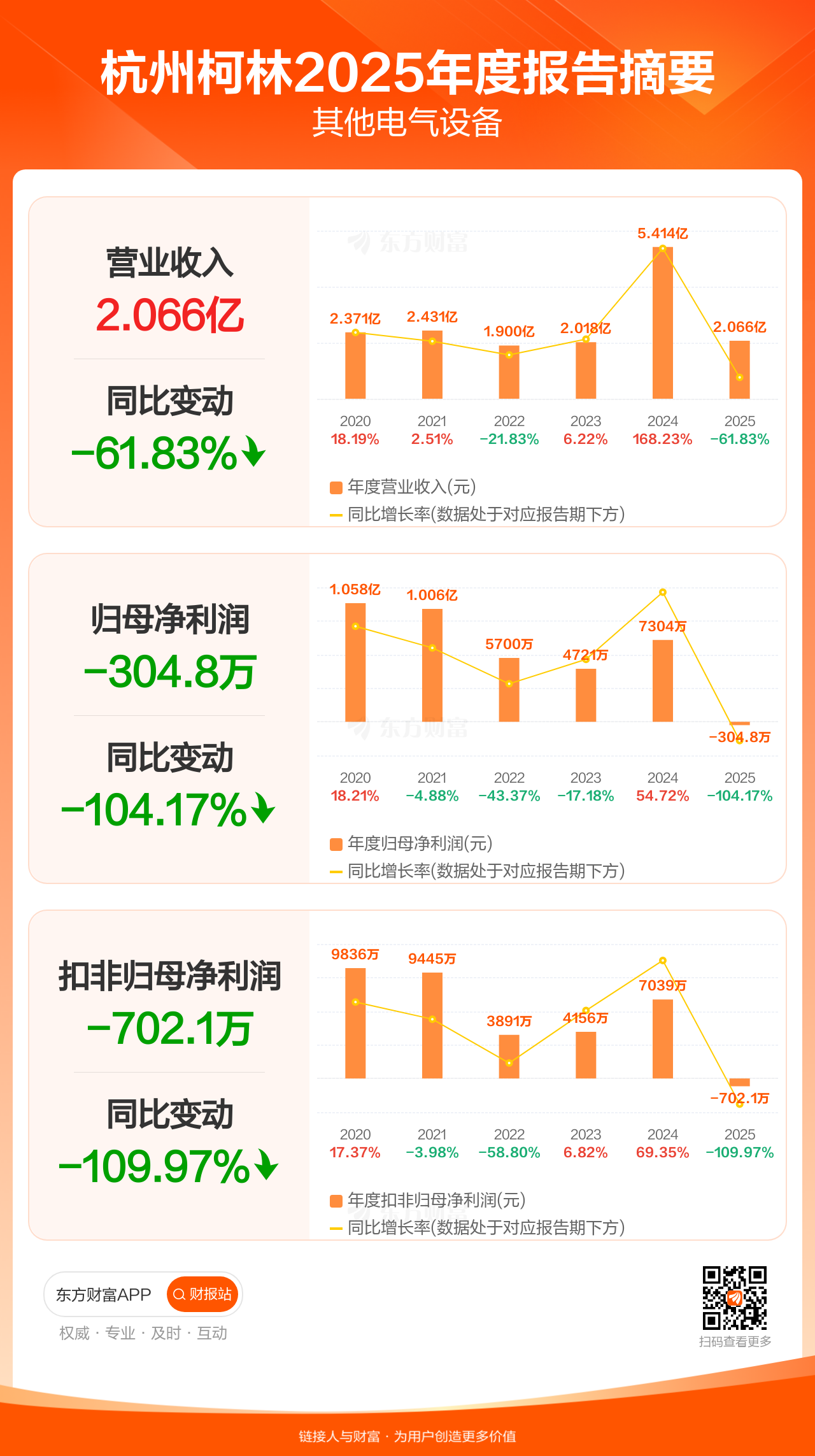 杭州柯林4月22日发布2025年年报显示,公司全年实现营业收入2.07亿元,同比下滑61.83%;归母净利润-304.75万元;扣非归母净利润-702.10万元。