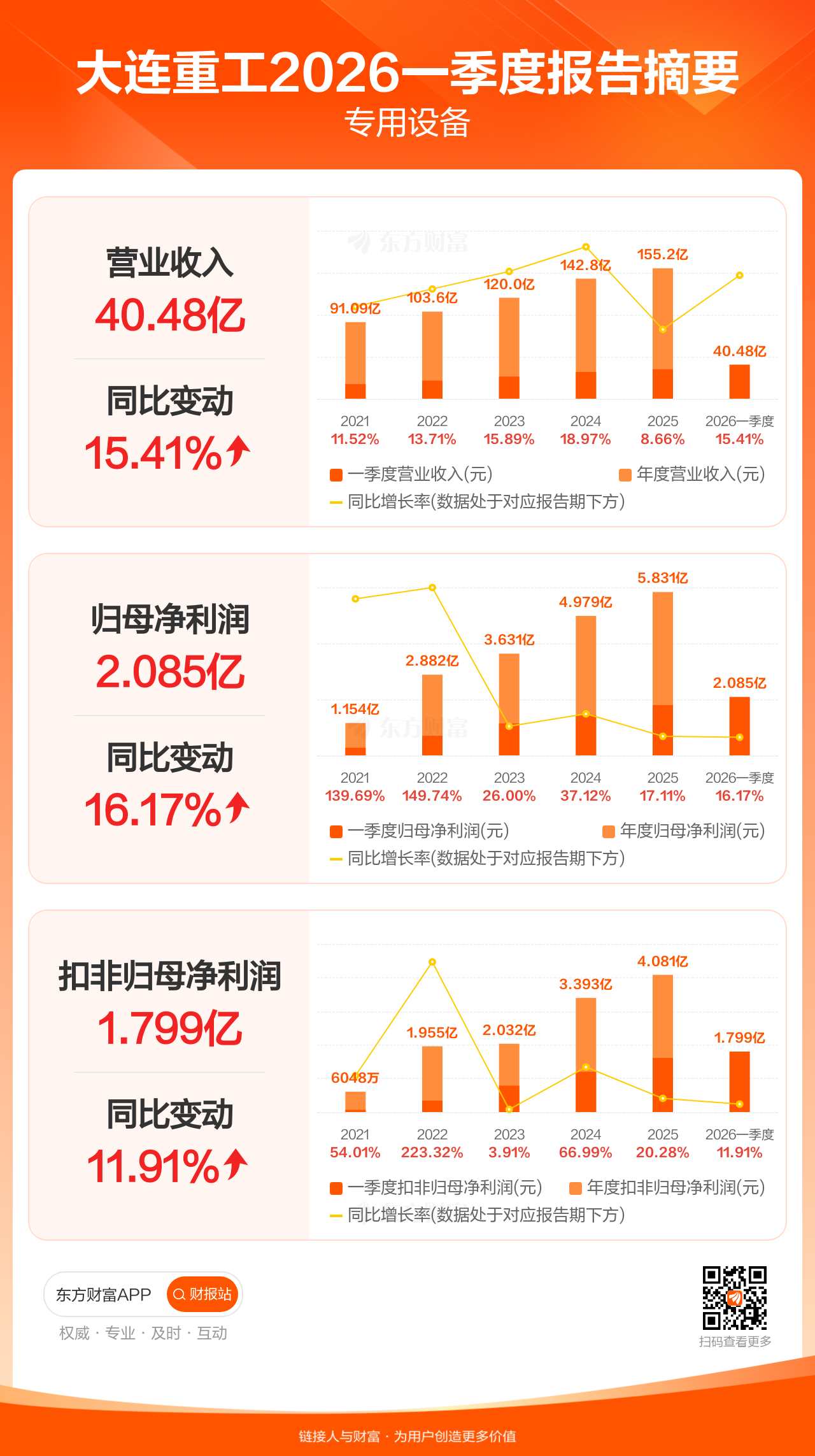 大连重工4月22日发布2026年一季报显示,公司一季度实现营业收入40.48亿元,同比增长15.41%;归母净利润2.08亿元,同比增长16.17%;扣非归母净利润1.80亿元,同比增长11.91%。