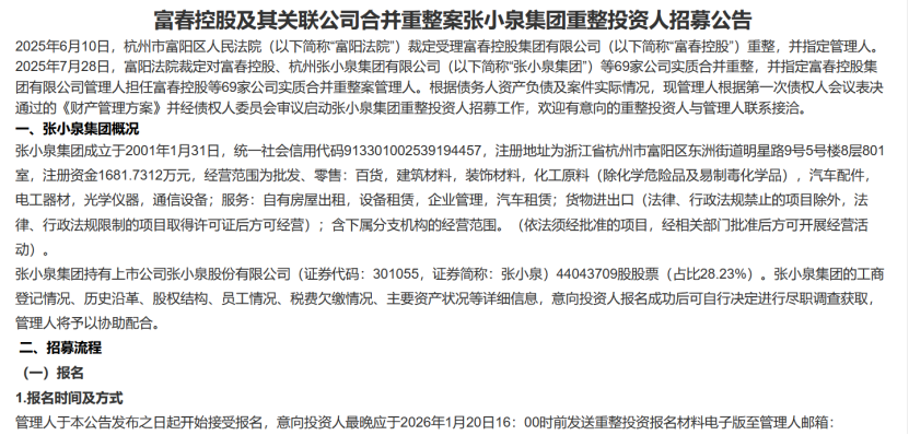 今年4月17日,张小泉发布公告称,公司于当日收到股东富春控股集团有限公司(以下简称富春控股集团)及其关联公司合并重整案管理人出具的《告知函》,蒋学明名下公司担任执行事务合伙人的杭州富阳瀚朋启琛自有资金投资合伙企业(有限合伙)(下称:“瀚朋启琛”),被确定为张小泉的中选投资人。