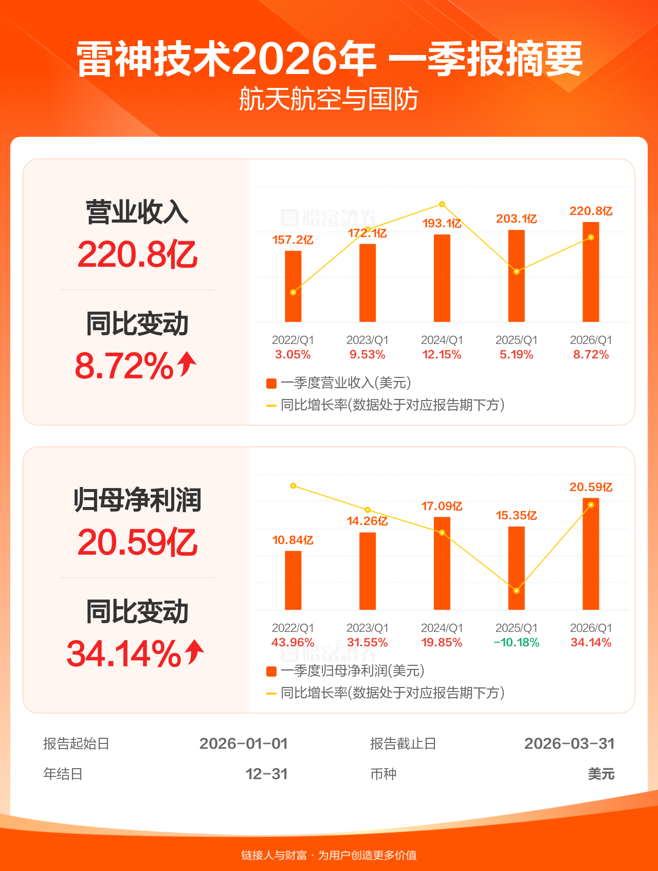 雷神技术4月21日发布一季报业绩,截至2026年3月31日的3个月内,该公司营业收入220.76亿美元,同比增长8.72%;公司权益持有人应占溢利(归母净利润)20.59亿美元,同比增长34.14%。