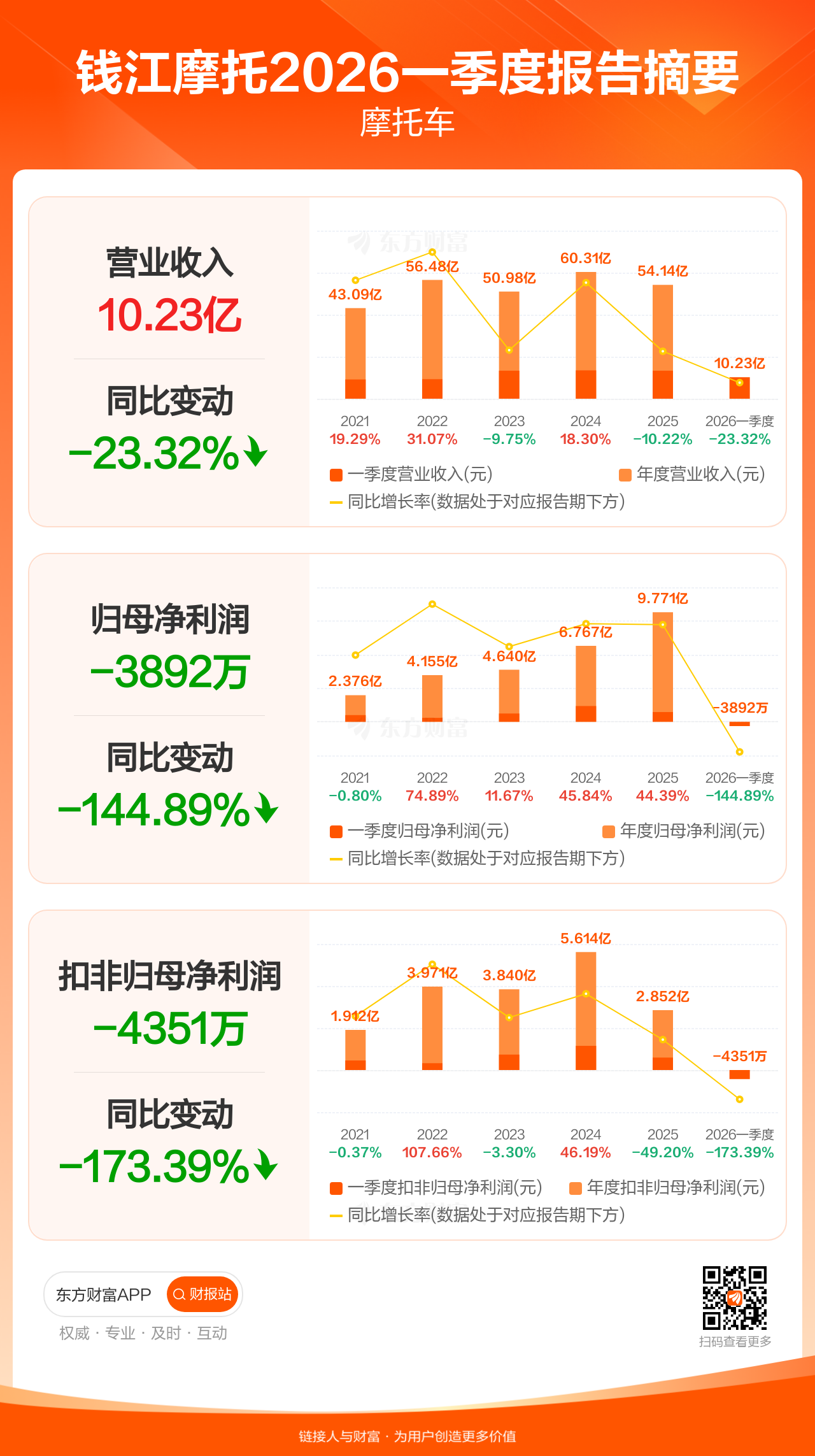 钱江摩托4月22日发布2026年一季报显示,公司一季度实现营业收入10.23亿元,同比下滑23.32%;归母净利润-3891.97万元;扣非归母净利润-4351.07万元。