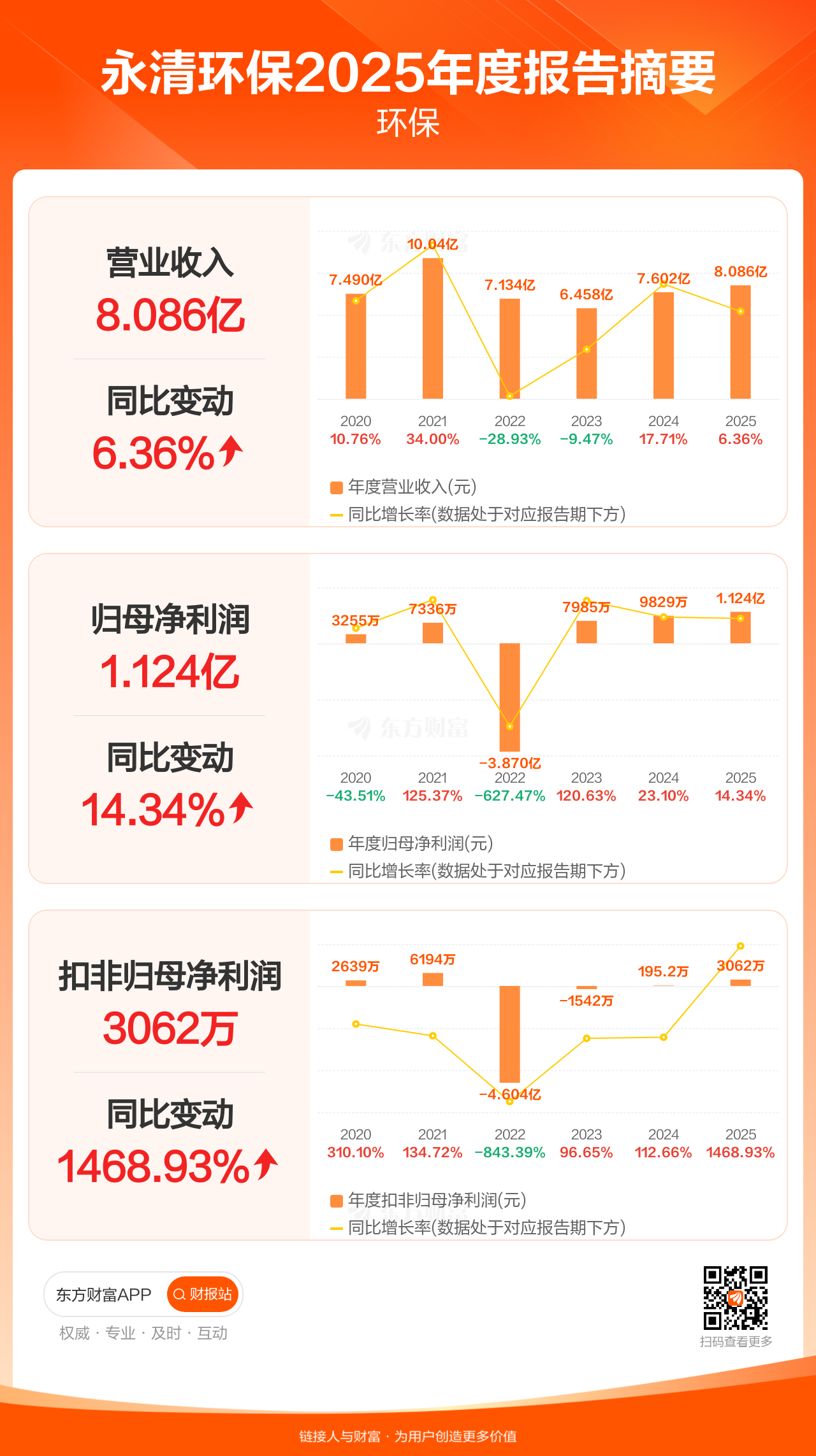 永清环保4月22日发布2025年年报显示,公司全年实现营业收入8.09亿元,同比增长6.36%;归母净利润1.12亿元,同比增长14.34%;扣非归母净利润3062.03万元,同比增长1468.93%。
