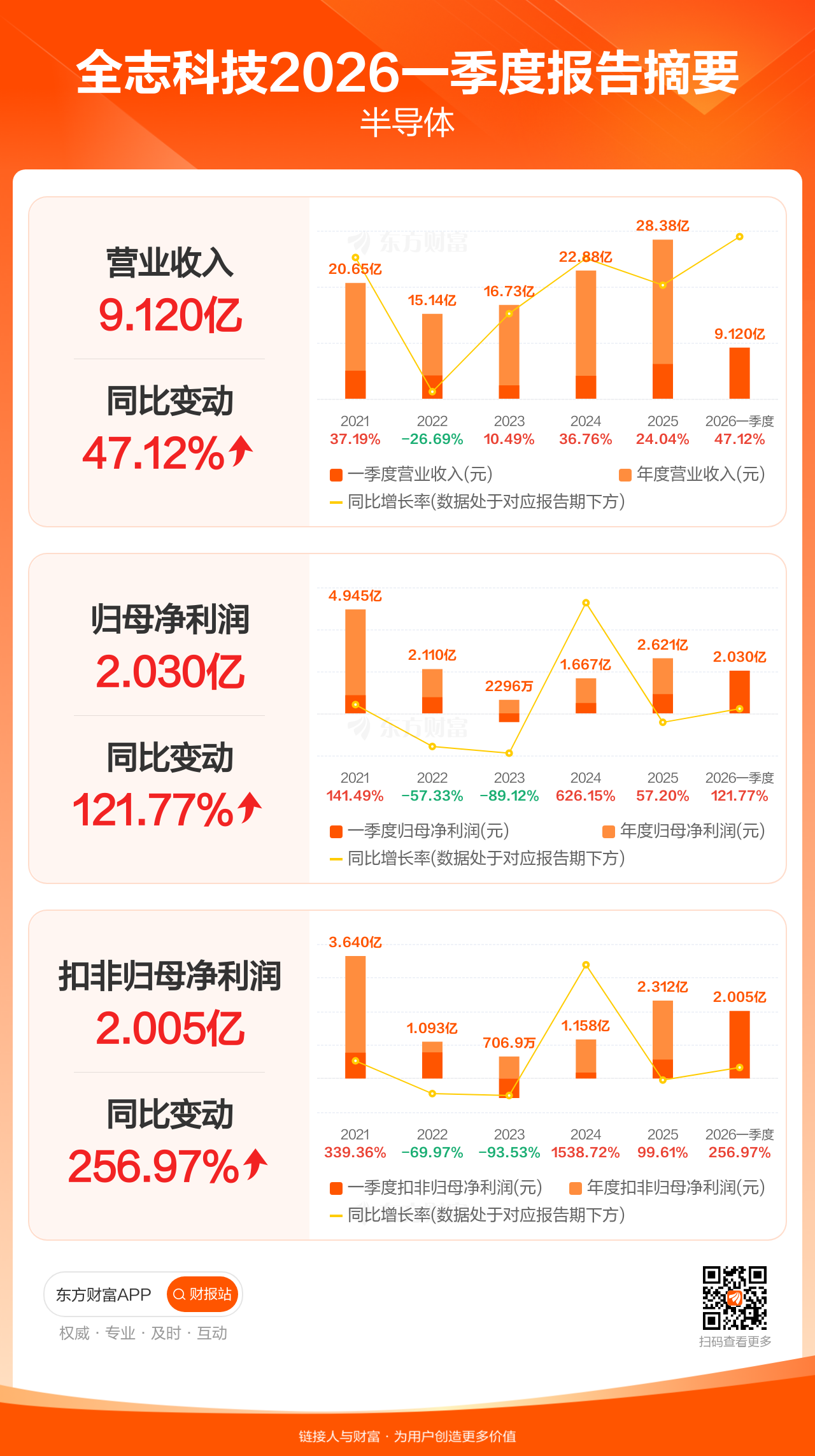 全志科技4月22日发布2026年一季报显示,公司一季度实现营业收入9.12亿元,同比增长47.12%;归母净利润2.03亿元,同比增长121.77%;扣非归母净利润2.01亿元,同比增长256.97%。