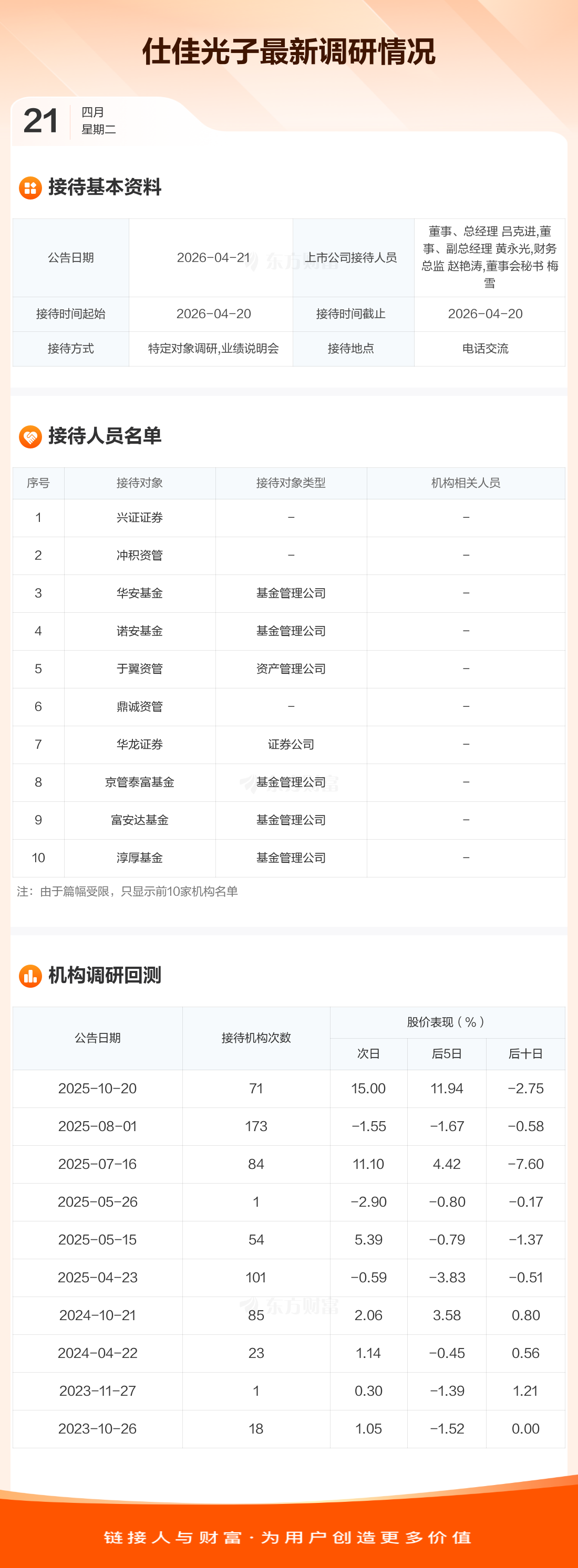 仕佳光子4月21日公告称,4月20日接待兴证证券等125家机构调研。接待人员包括董事、总经理 吕克进,董事、副总经理 黄永光,财务总监 赵艳涛,董事会秘书 梅雪。