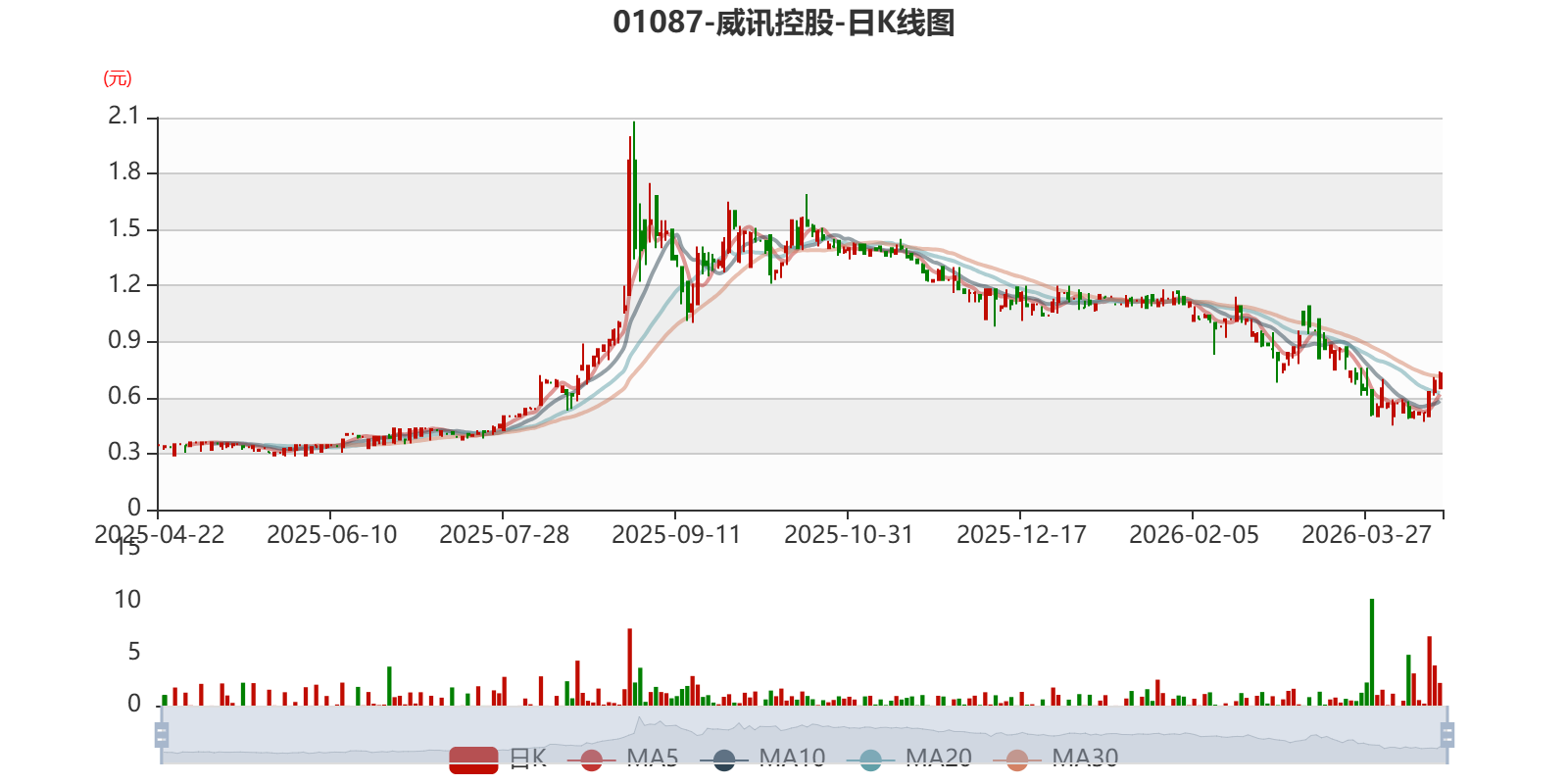 以4月20日收盘价计算,威讯控股目前市净率(TTM)约0.75倍,市销率(TTM)约0.22倍。