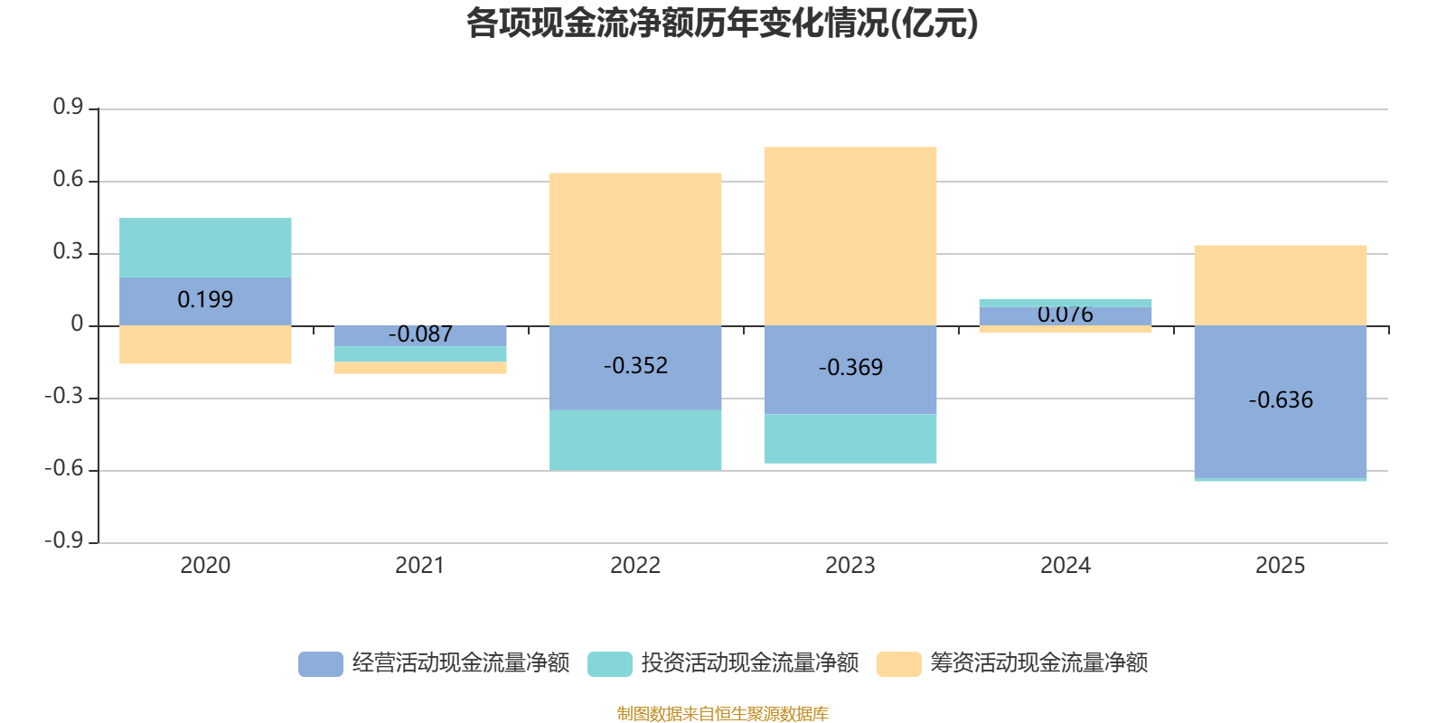 2025年,公司经营活动现金流净额为-6359.8万元,同比减少7123.8万元;筹资活动现金流净额3318.1万元,同比增加3622.4万元;投资活动现金流净额-106.7万元,上年同期为328万元。