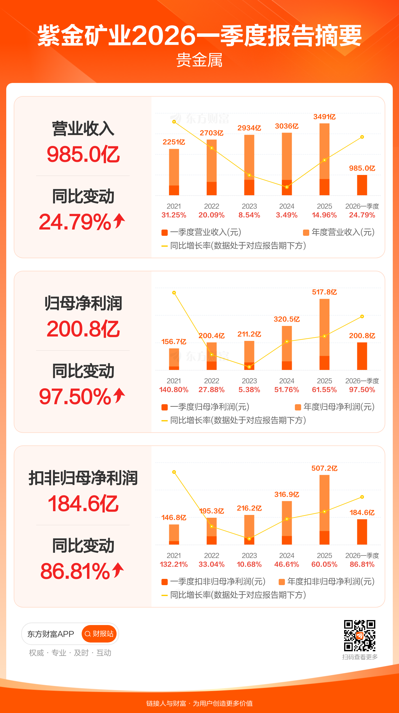 紫金矿业4月22日发布2026年一季报显示,公司一季度实现营业收入984.98亿元,同比增长24.79%;归母净利润200.79亿元,同比增长97.50%;扣非归母净利润184.59亿元,同比增长86.81%。