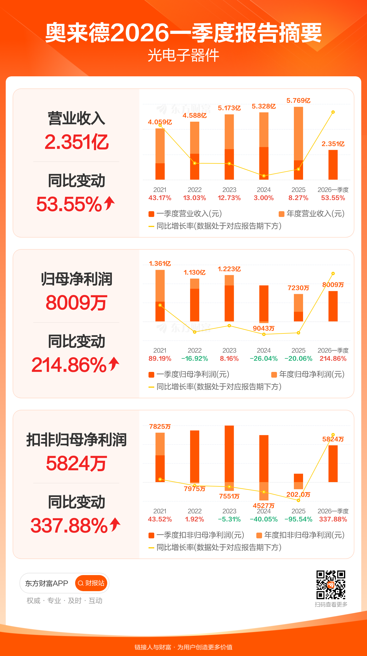 奥来德4月22日发布2026年一季报显示,公司一季度实现营业收入2.35亿元,同比增长53.55%;归母净利润8008.75万元,同比增长214.86%;扣非归母净利润5823.95万元,同比增长337.88%。