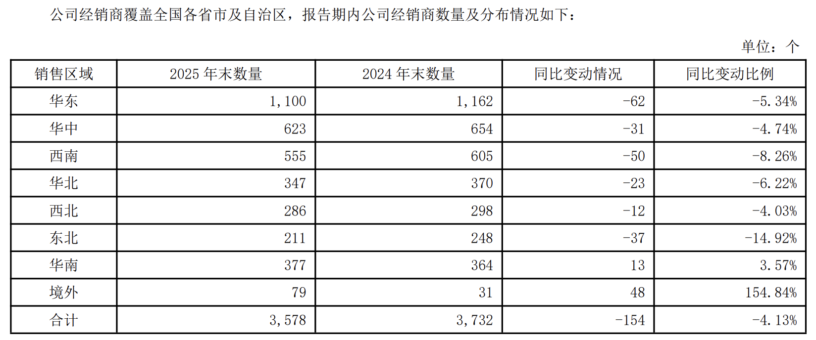 数据显示,去年公司经销商数量整体出现下滑,降幅为4.13%。分地区来看,境内仅华南地区经销商数量有增长。此外,境外经销商数量同比增长154.84%,主要系公司积极拓展海外市场,客户数量增长所致。